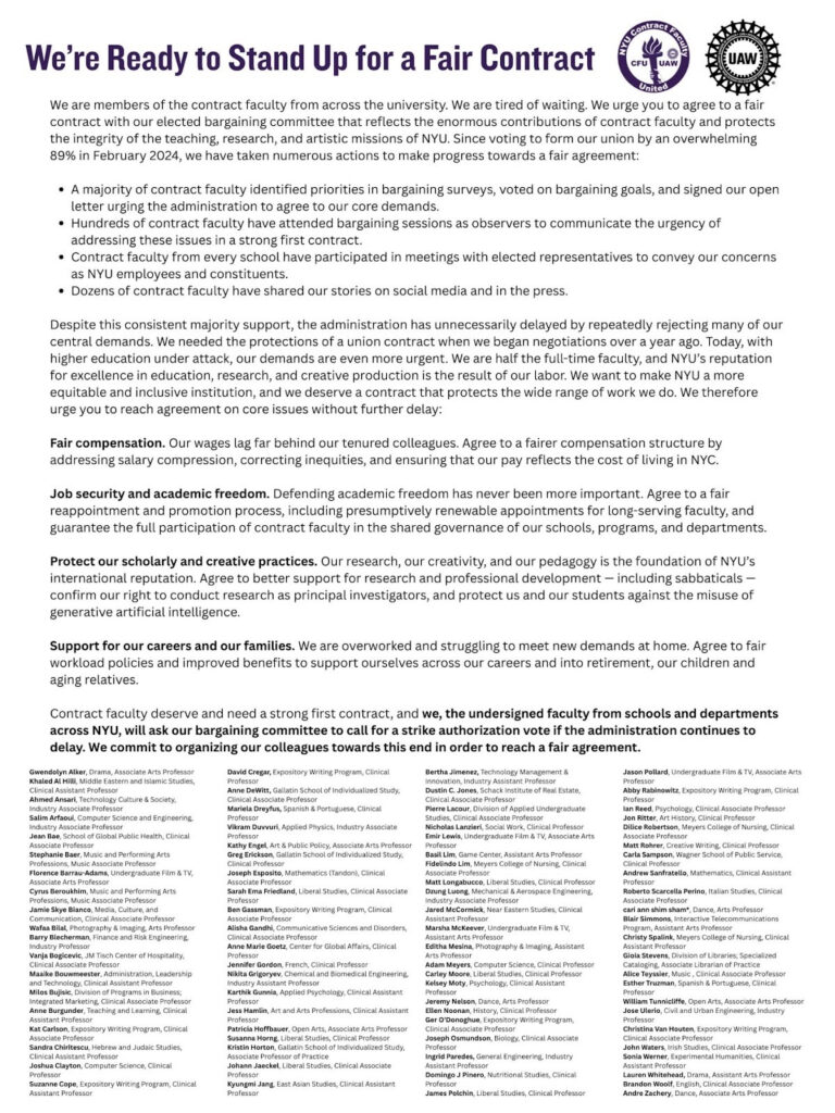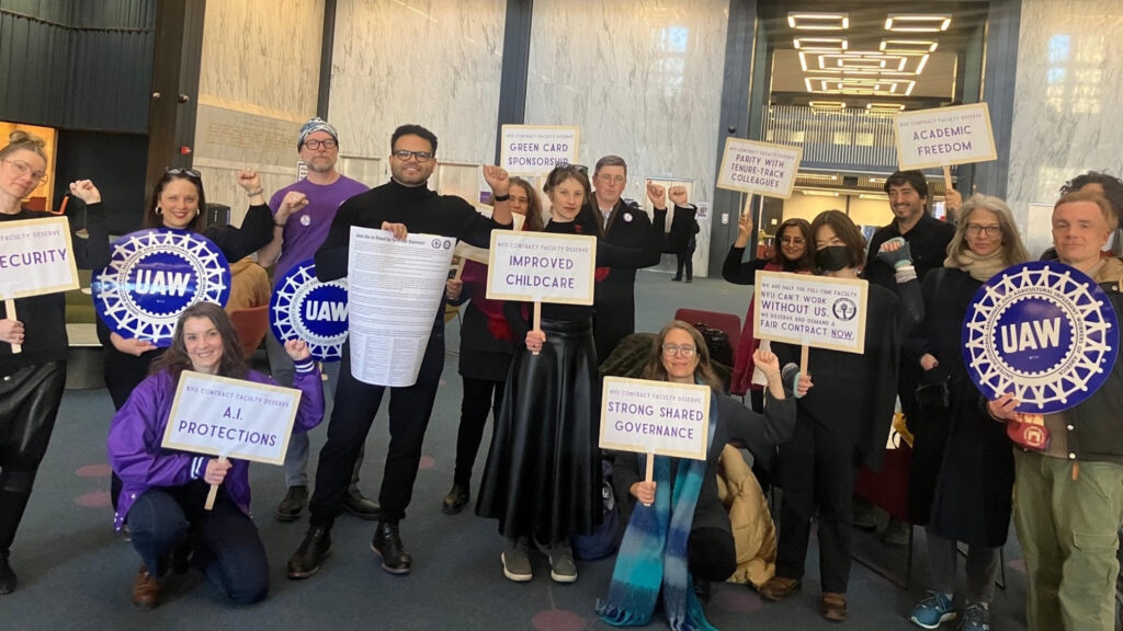 Alongside us, tenured faculty led by our local chapter of the American Association of University Professors (NYU-AAUP) presented their own petition of support for our effort. Over 250 tenured and tenure-track faculty from across the university called on the administration to agree to a contract that defends shared governance and enshrined parity between tenured and contract faculty lines.