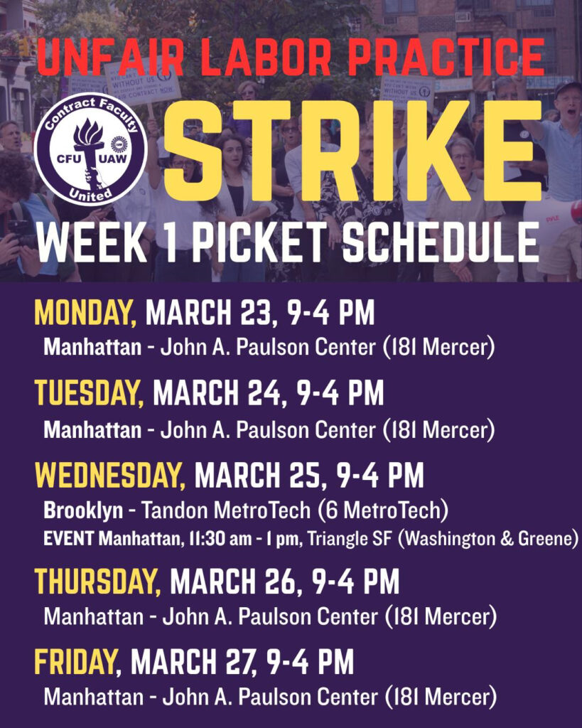 We met with the NYU administration twice this week so far, with more to come on Friday. We are getting closer to meaningful presumption of reappointment, and we’ve seen encouraging movement on leaves, benefits, and retirement options. We’ve also made strategic movement to concentrate our power and ensure that we’re focused on the issues that contract faculty care about most as our strike deadline approaches.